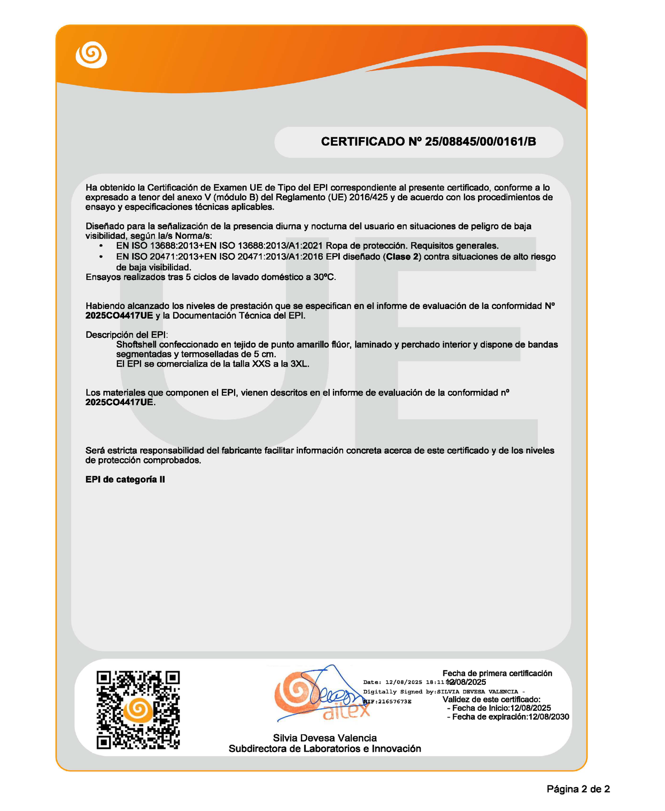 EN ISO 20471:2013/A1:2016 como prenda CLASE 2 de material alta visibilidad.